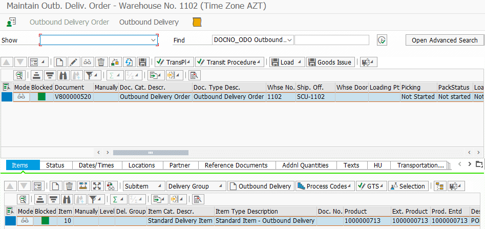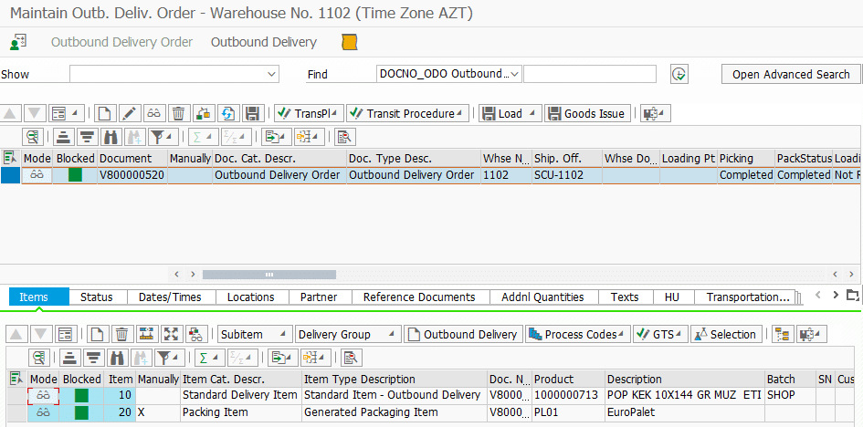 Nümunə göstərmək üçün ilk öncə bizə SAS və SAS-a istinadən yaradılan göndərilən təslimat lazımdır. Təslimatın depo sifarişlərini yaradıb, məhsulları toplamağa başlayaq (mal çıxışı geniş yazı üçün bu linkə keçid edə bilərsiniz).