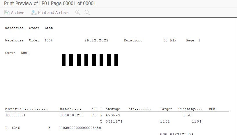 Və beləliklə, hər dəfə 9998 proses növü ilə təsdiqlənən bütün depo əmrlərinin sonunda avtomatik olaraq etiketimiz çapa çıxacaq. Etiketin nümunəsi aşağıda yerləşdirilib. Nümunə standart etiketdir. Əlbəttə, üzərində istəyə uyğun dəyişiklik etmək mümkündür.